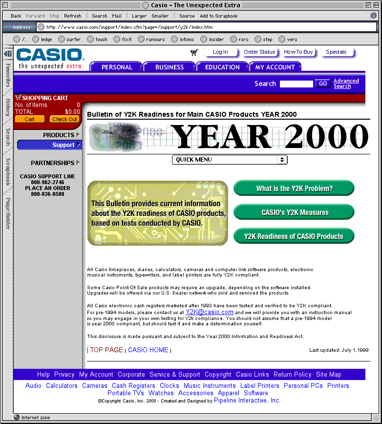 This calculator (as do many other CASIO scientific calculators) uses one and the same key for both the constant π as well as exponents. This works as follows. When you first enter digits, the EXP key will enable you to enter the exponent, otherwise it will enter the constant π. According to the CASIO web site, all CASIO calculators are millennium-proof. That page is no longer there but I’ve saved it and you can view the saved page here (opens in a new window). It also states that pre-1994 models might not be millennium-proof, I don’t know then the CASIO fx-8100 was introduced. When the year leaps from ’99 to ’00 the calculator won’t display the date anymore. Any attempt to get the date results in an error "E" display. Take a look at the CASIO fx-8000 too, which falls in the same category as this calculator. I would like to thank RoB Beekmans for donating this nice and popular calculator to the museum. |
